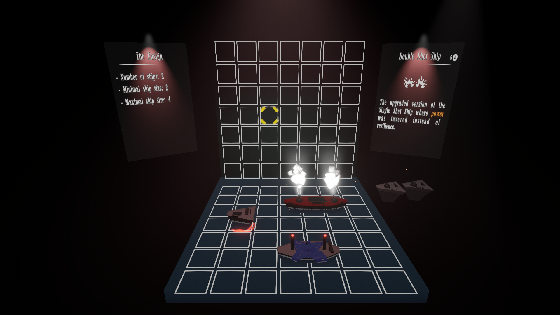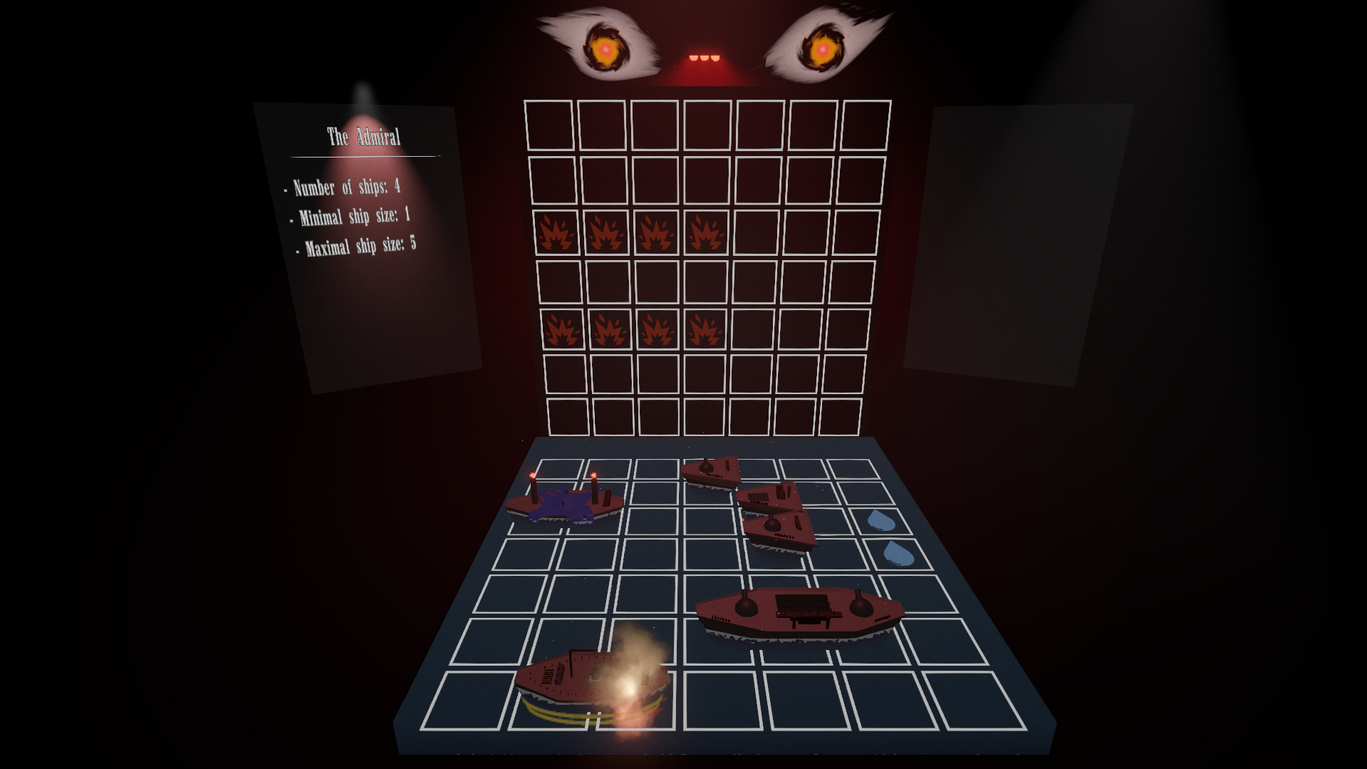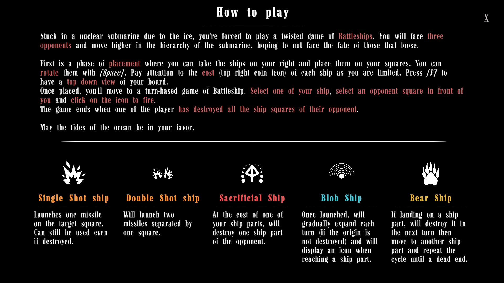 Stuck in a nuclear submarine due to the ice, you're forced to play a twisted game of Battleships. You will face three opponents and move higher in the hierarchy of the submarine, hoping to not face the fate of those that loose...